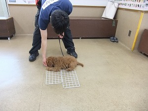 5月27日 足場慣れ いつもと違う足場だと避けて通ったり、飛び越えてしまう子はたくさんいます。 どんな足場の上でもきちんと歩けるようなしつけトレーニングを行います^^ もずくちゃんは不安定な足場の上でもフセをすることができました!