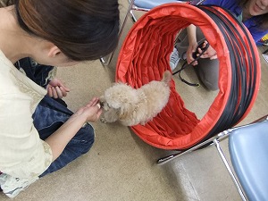 5月28日 トンネル 初めてのトンネルにドキドキ…トンネルは怖がってしまう子がたくさんいますが、 克服できるとアジリティーにも挑戦できます^^ 苦手なものが減ると新しいことにたくさん挑戦できて、毎日楽しみがいっぱいだね☆