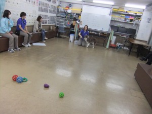 7月3日 おもちゃ選び K9という競技の種目の簡単な実演を行いました☆ この種目はトイ・レトリーブ。たくさんのおもちゃの中からハンドラーの持ってきてほしいものを選んで持ってきてもらいます。難しい作業なので、普段聞くことのないコマンドも聞けます♪ 他にもたくさんの種目がありますよ^^