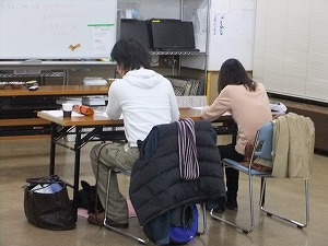 生徒さんは何やら読み物をしているようですが、しじみちゃんは足元で伏せをしてお利口さんですね!